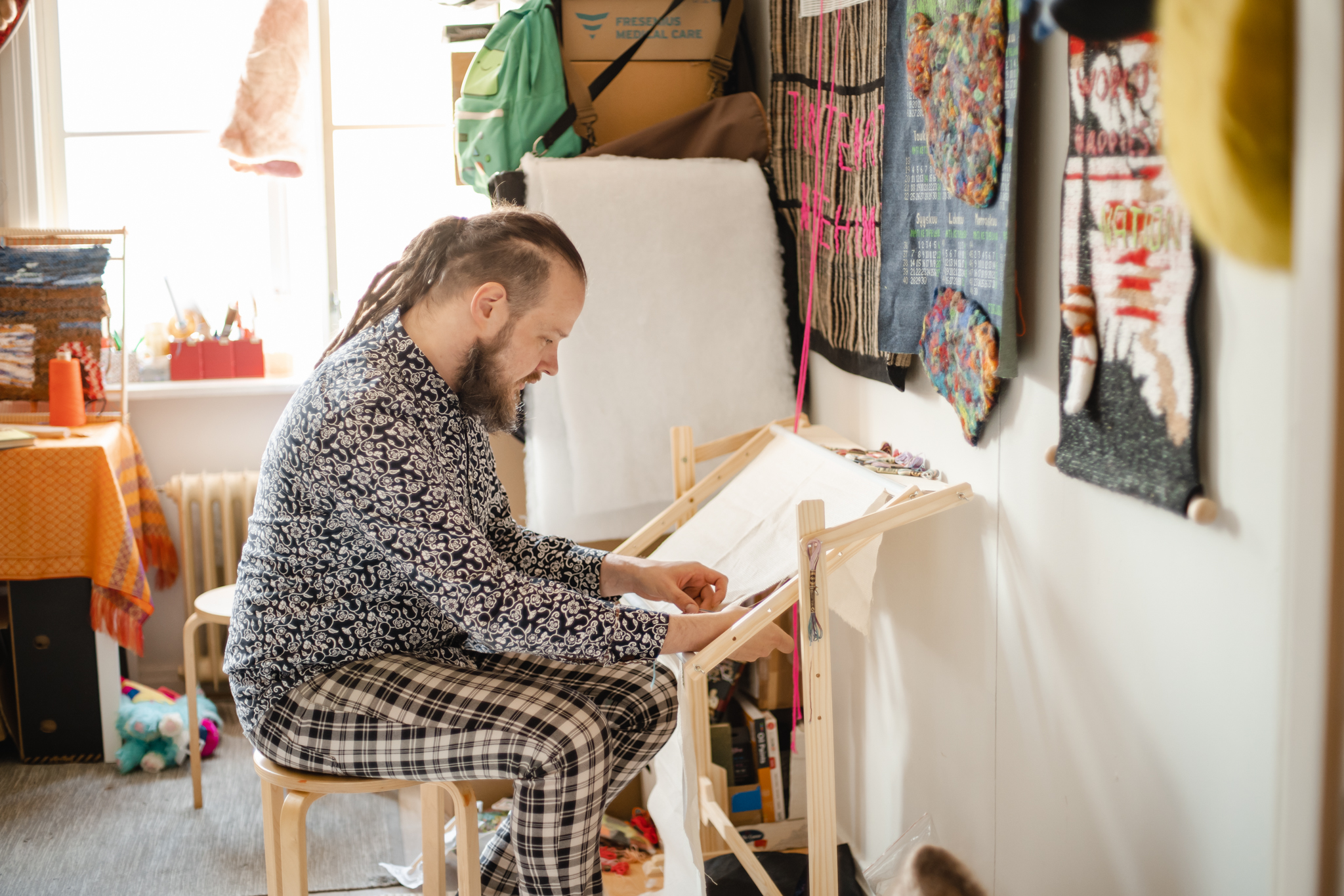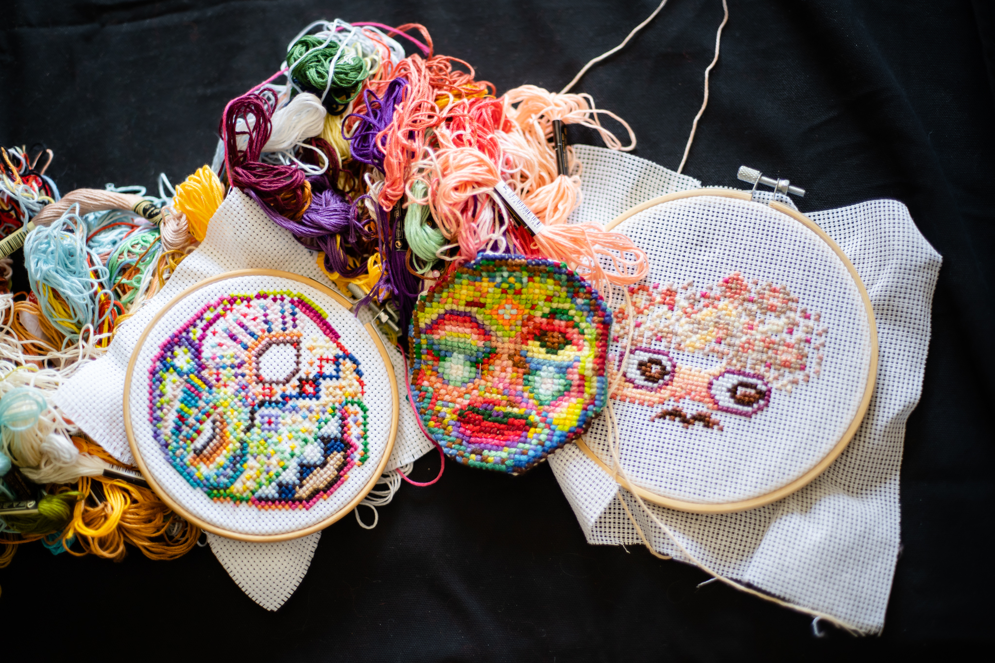 “Villahuovutus on anteeksiantava tekniikka. Se antaa luvan epäonnistua ja sillä voi suoraan tehdä tekstiilistä veistomaisia kokonaisuuksia. Uusin tekniikka, johon olen tykästynyt on ristipistot. Minua viehättää pikseligrafiikka ja retropelien estetiikka. Toteutan ristipistoja niin, että ensin tietokoneella työstän jonkun kuvan pikseligrafiikkamuotoon ja sitten sitä seuraillen alan toteuttamaan ristipistoa kankaalla. Eli niistä tulee pikseligrafiikan toisintoja fyysisessä muodossa.”